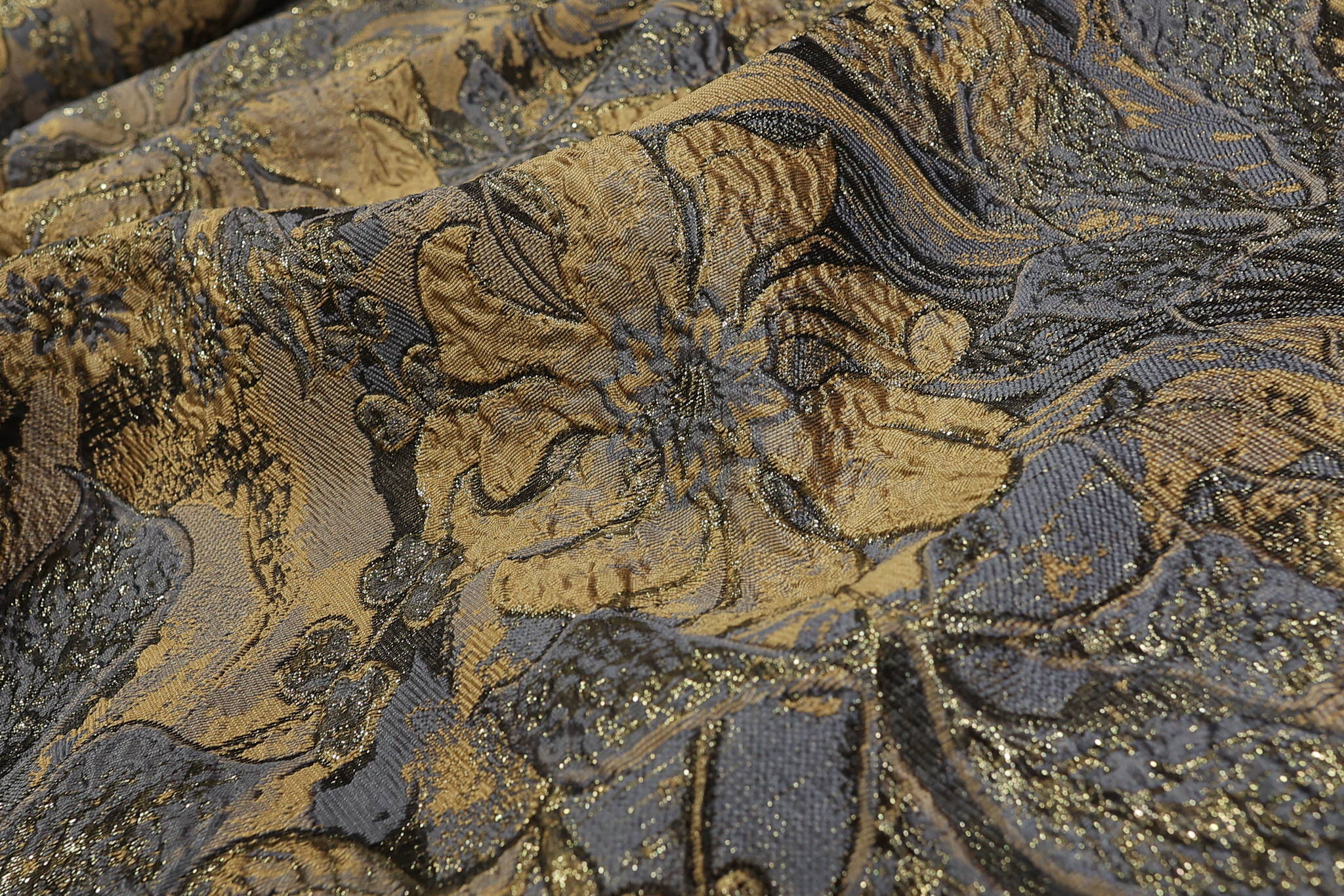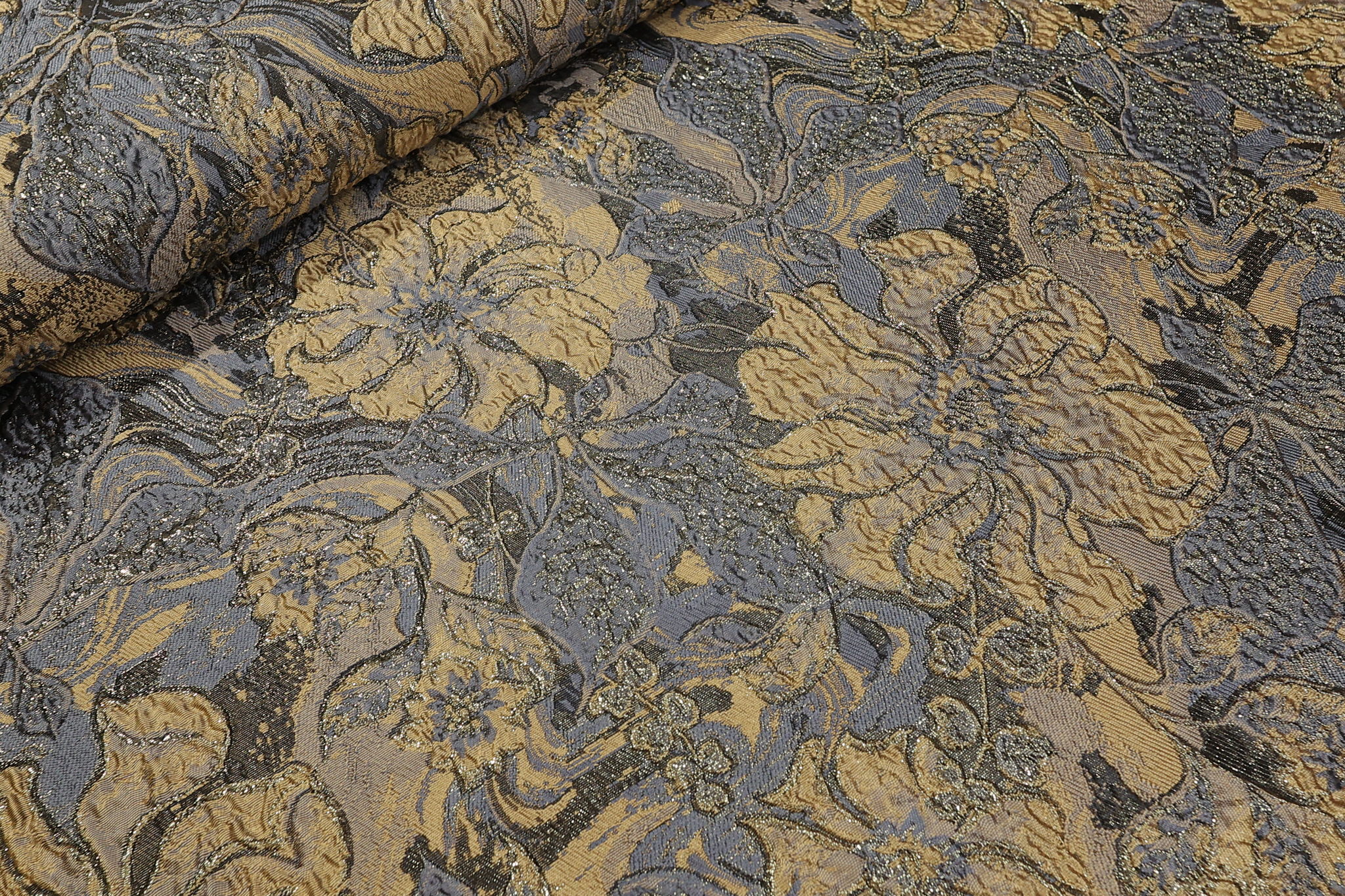Unesite strast i luksuz u svoje kreacije sa ovim unikatnim brokatom u bež boji. Materijal krase bogati cvetni motivi protkani metaliziranim nitima u bež nijansi, stvarajući dinamičan sjaj koji se menja sa svakim vašim pokretom. Savršen je izbor za modne dizajnere i ljubitelje unikatne odeće koji traže materijal koji odiše glamurom.