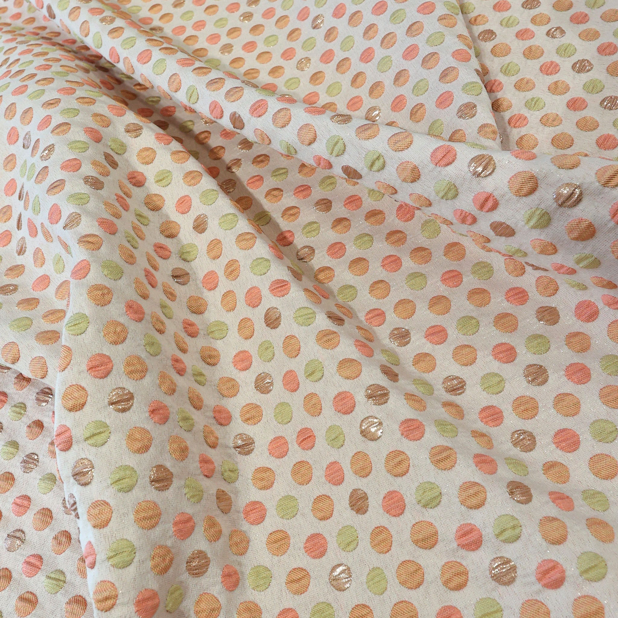 Ovaj sofisticirani brokat donosi nežni dezen sitnih tačaka u svežim, svetlim nijansama, uz sporadične zlatne tufne izrađene od lamiranog konca, dodajući mu raskošan sjaj i prefinjenost. Svetla podloga osvetljava detalje, naglašavajući njegovu teksturu i stvarajući elegantan balans između tradicionalnog i modernog dizajna.