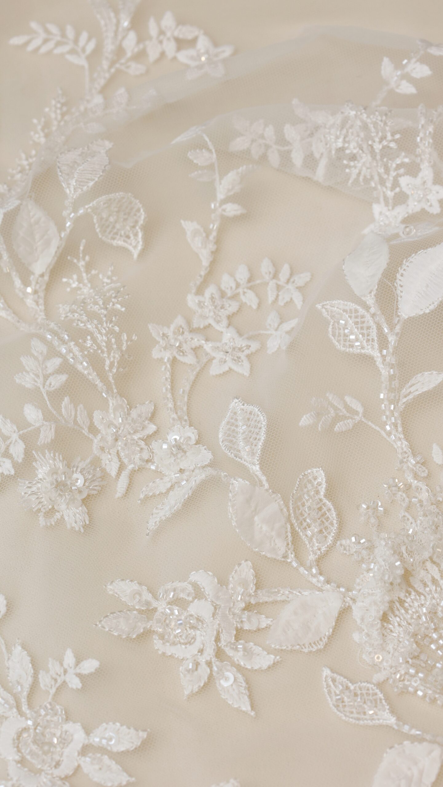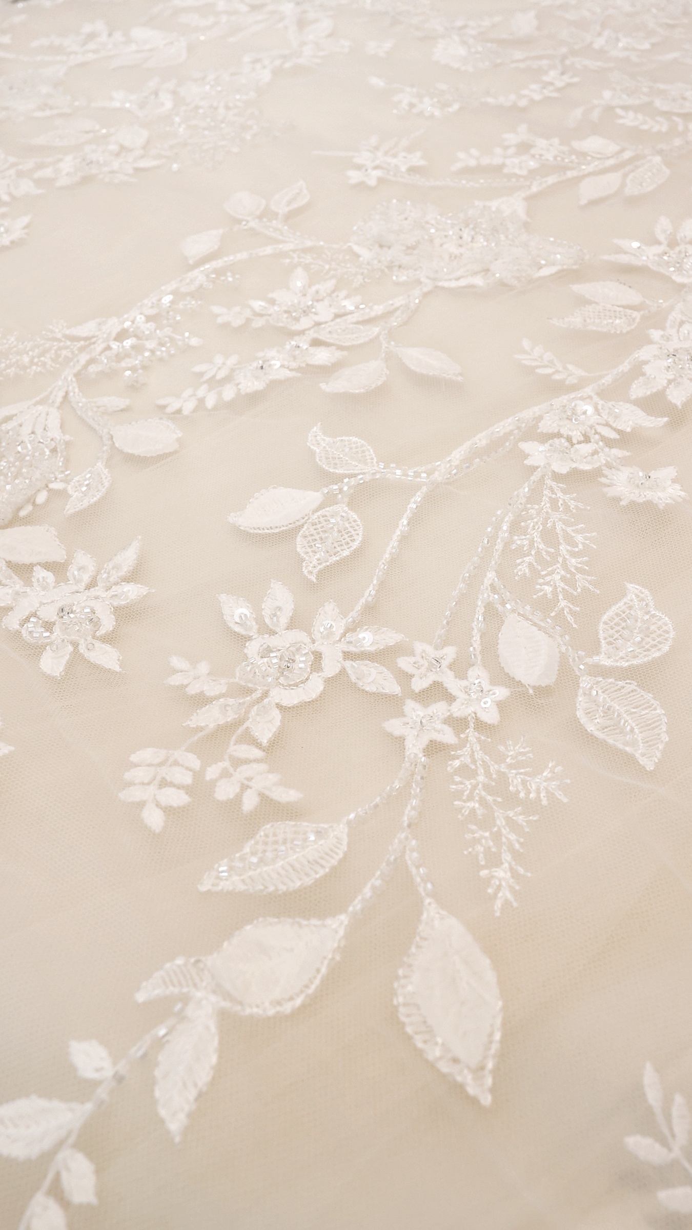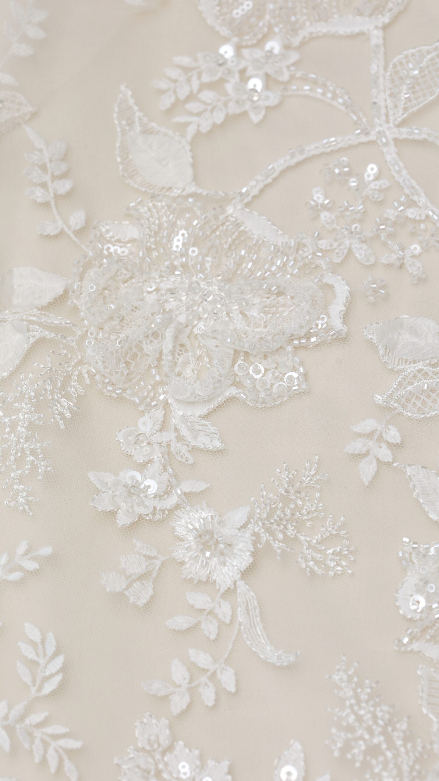 Ovaj model karakterišu bogato vezani cvetni motivi koji se izdižu iz osnove od mekanog, visokokvalitetnog tila. Svaki cvet je pažljivo osmišljen kako bi pružio dubinu i dinamiku pokretu, čineći je idealnim izborom za unikatne venčanice, balske haljine i luksuzne korsete.