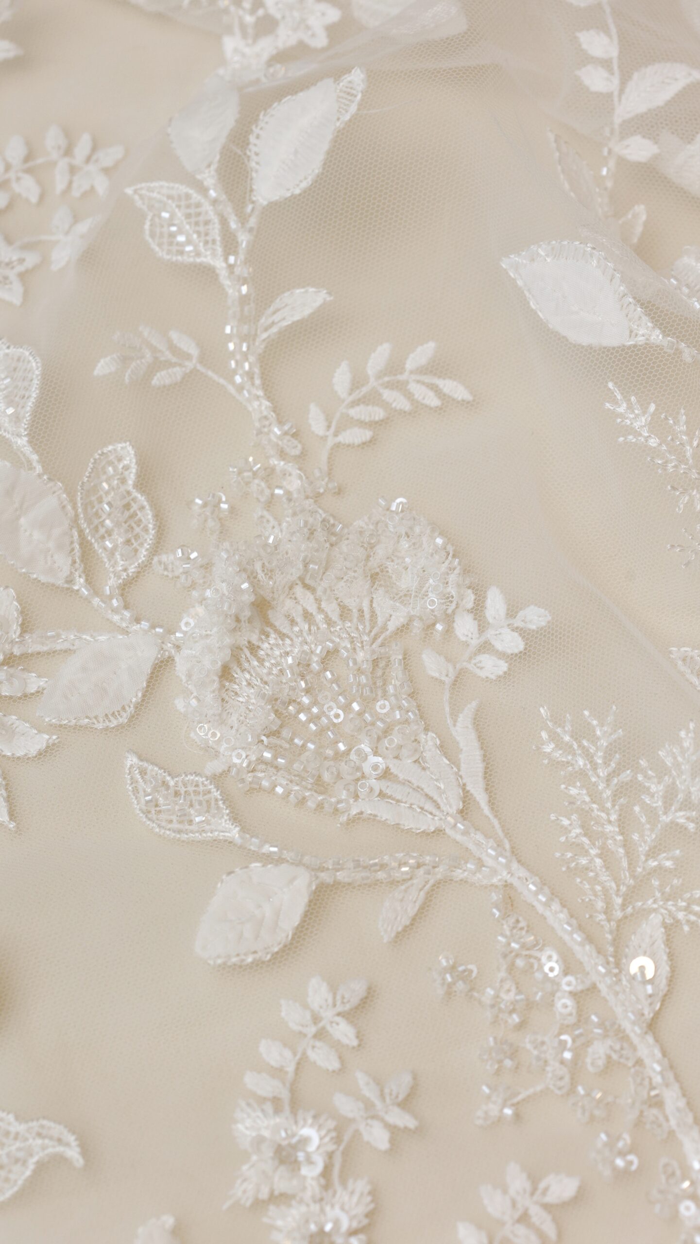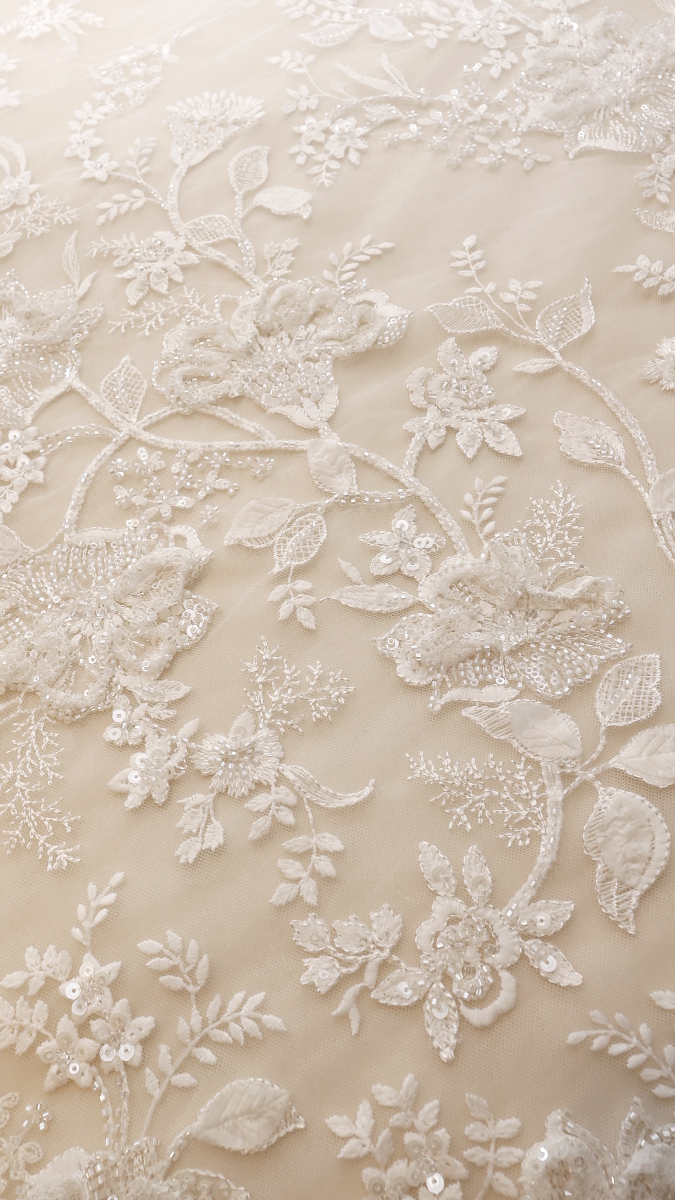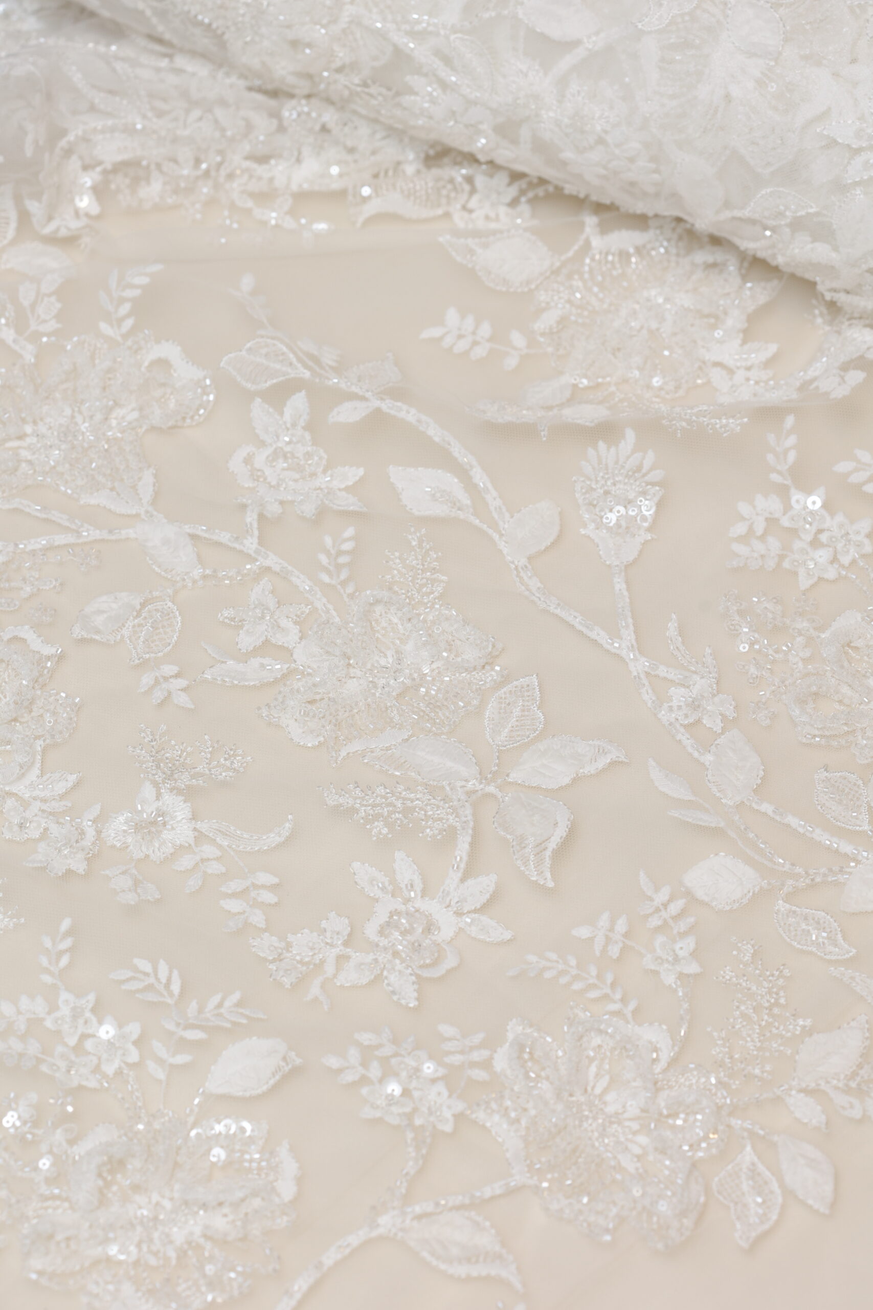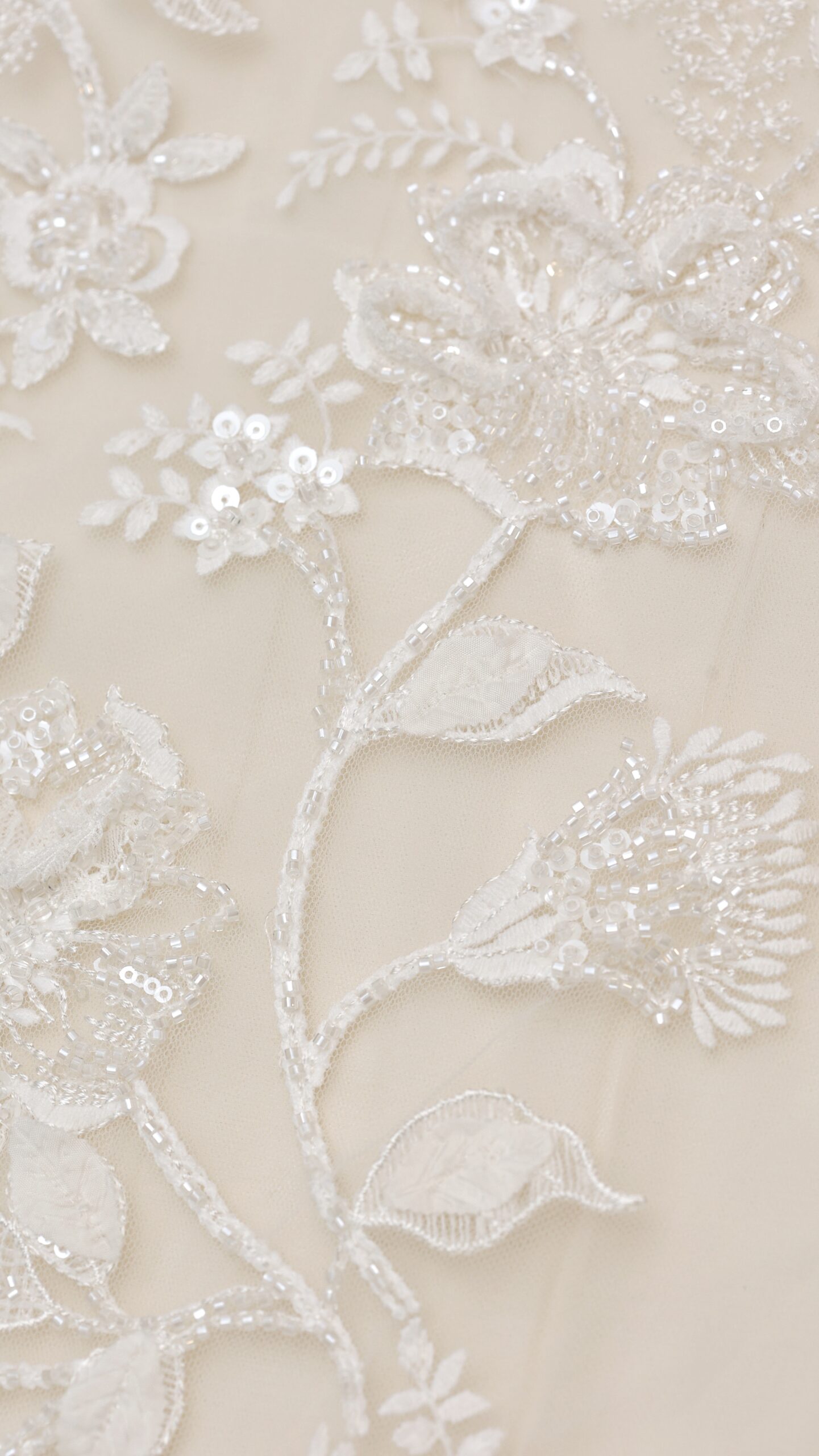 Ovaj model karakterišu bogato vezani cvetni motivi koji se izdižu iz osnove od mekanog, visokokvalitetnog tila. Svaki cvet je pažljivo osmišljen kako bi pružio dubinu i dinamiku pokretu, čineći je idealnim izborom za unikatne venčanice, balske haljine i luksuzne korsete.