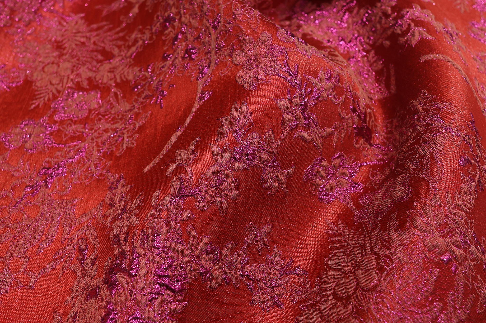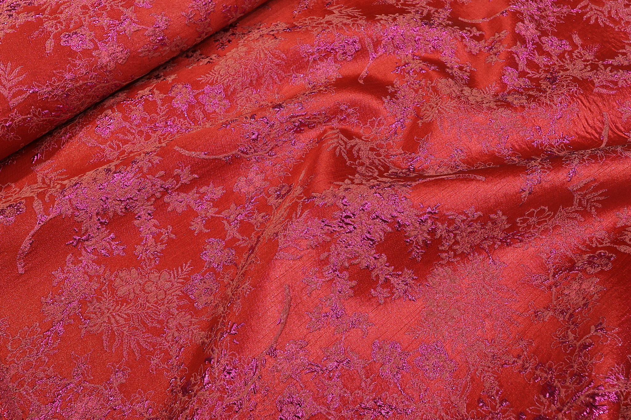 Unesite strast i luksuz u svoje kreacije sa ovim unikatnim brokatom u intenzivno crvenoj boji. Materijal krase bogati cvetni motivi protkani metaliziranim nitima u ciklama nijansi, stvarajući dinamičan sjaj koji se menja sa svakim vašim pokretom. Savršen je izbor za modne dizajnere i ljubitelje unikatne odeće koji traže materijal koji odiše glamurom.