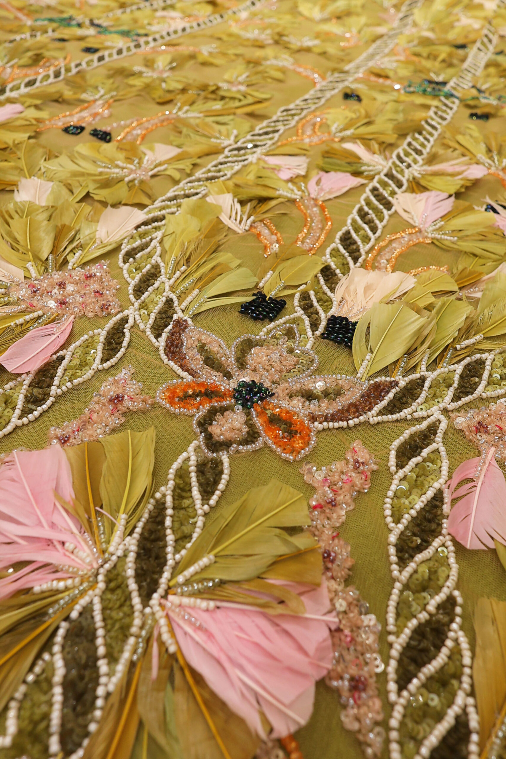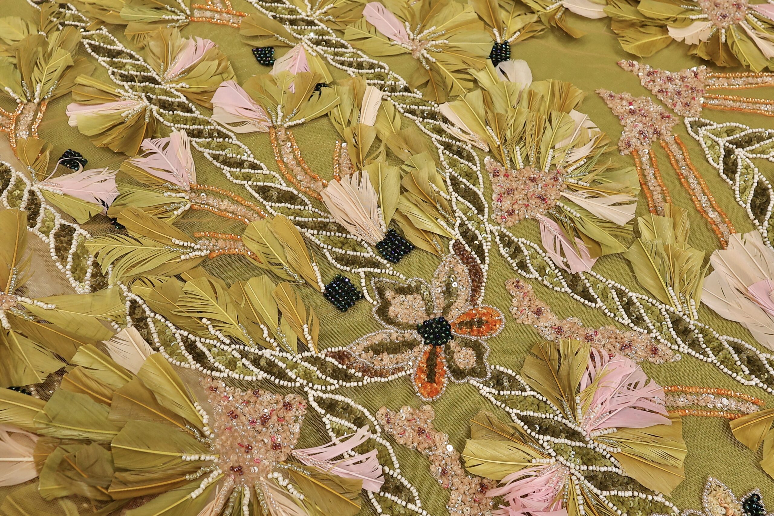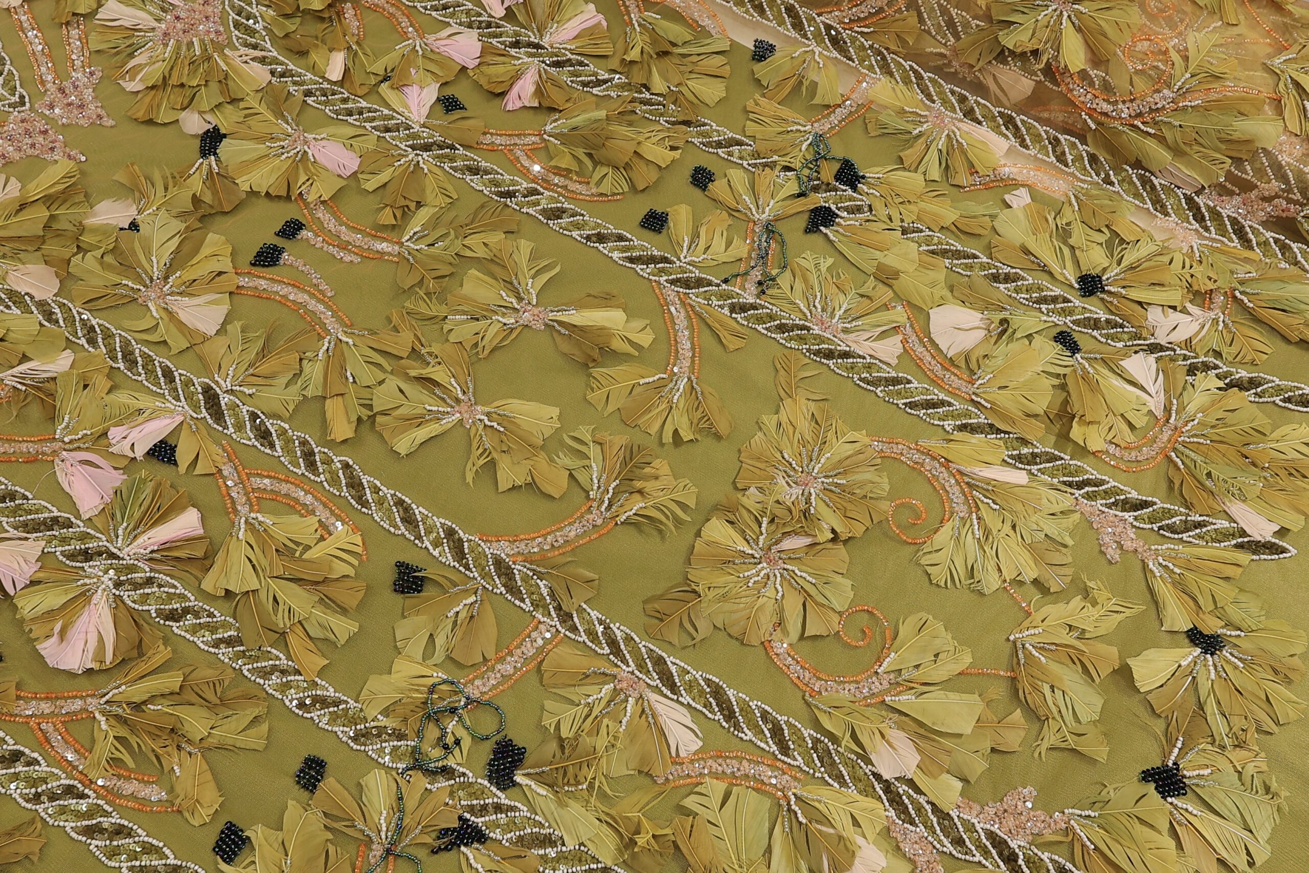 Ekskluzivna Ručno Rađena Haute Couture Čipka sa Perjem i Perlama – Maslinasta, puder i Pink.