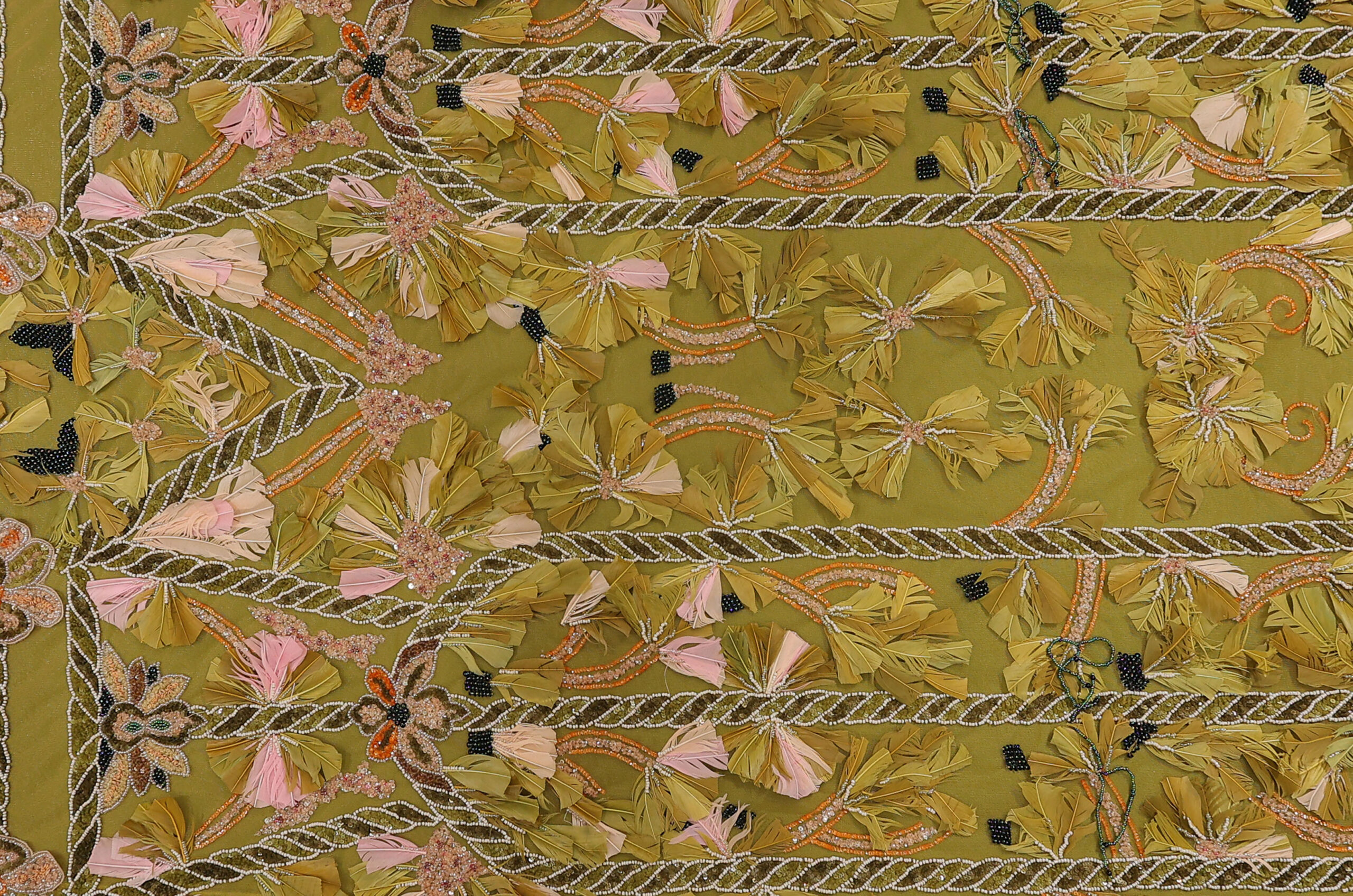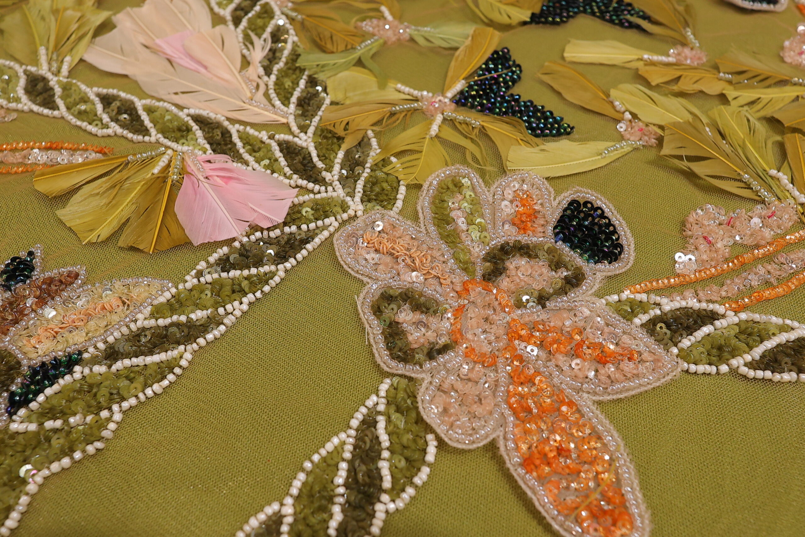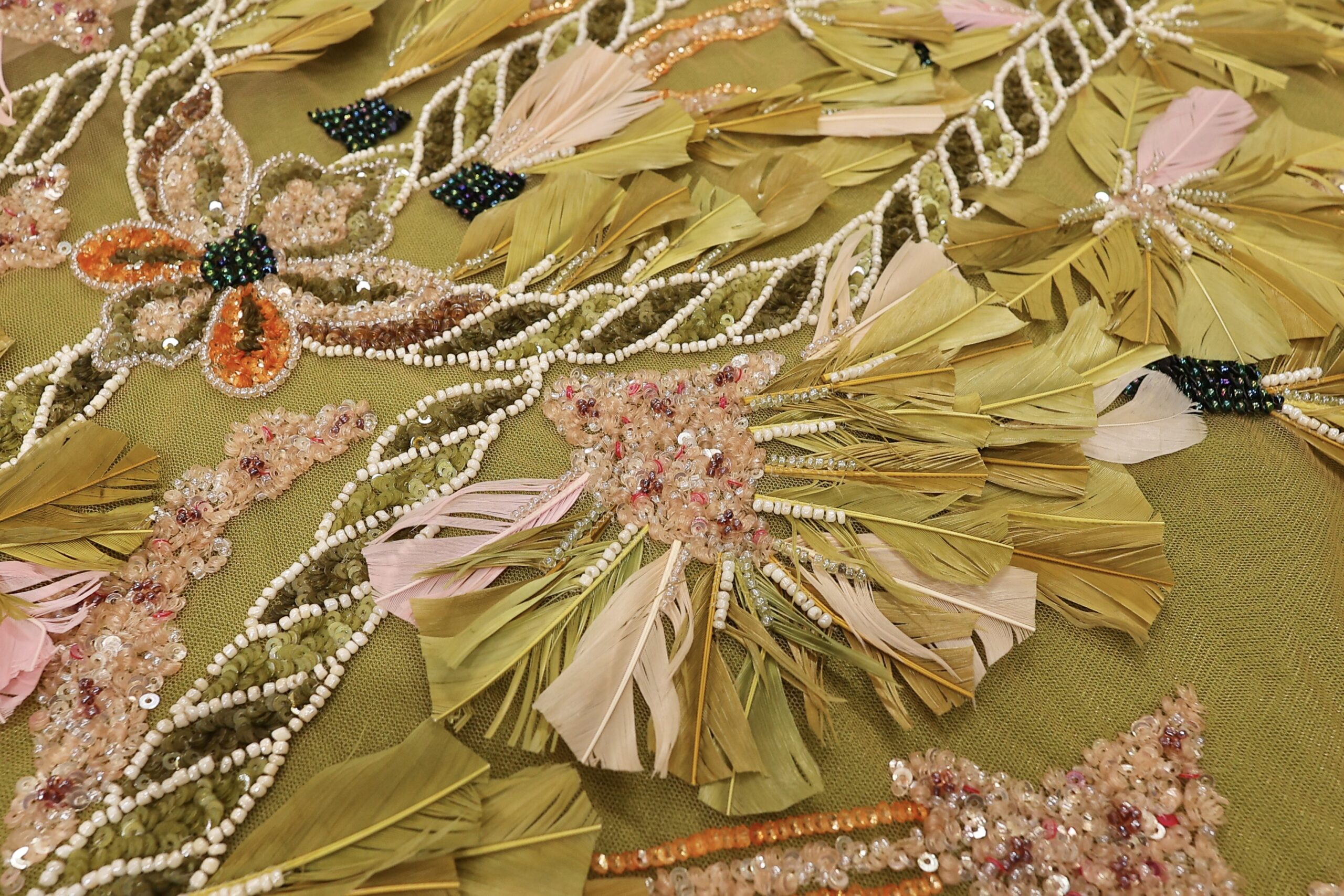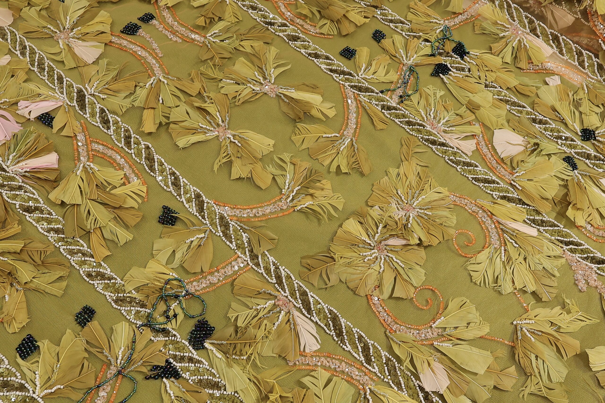 Ekskluzivna Ručno Rađena Haute Couture Čipka sa Perjem i Perlama – Maslinasta, puder i Pink.