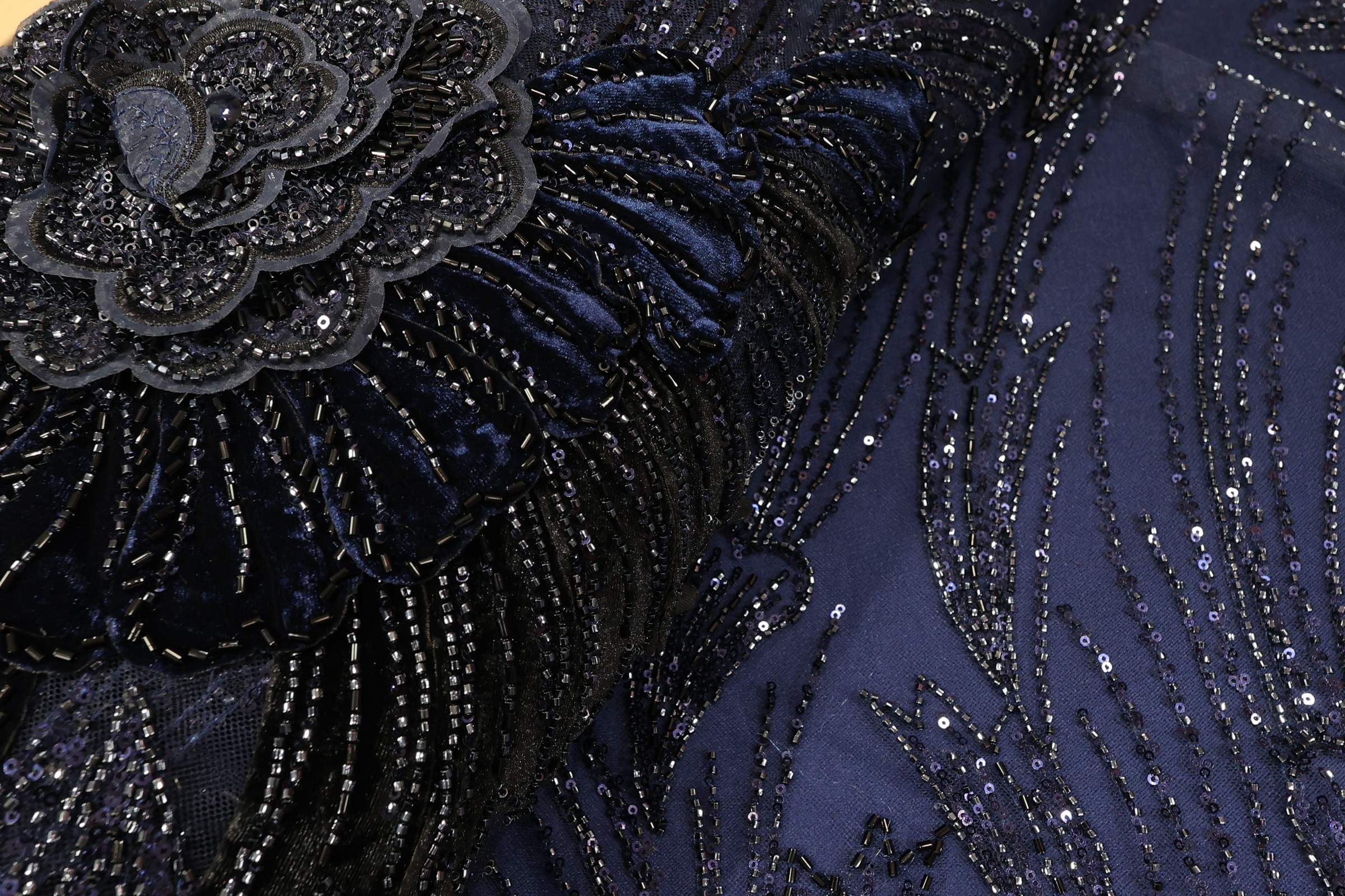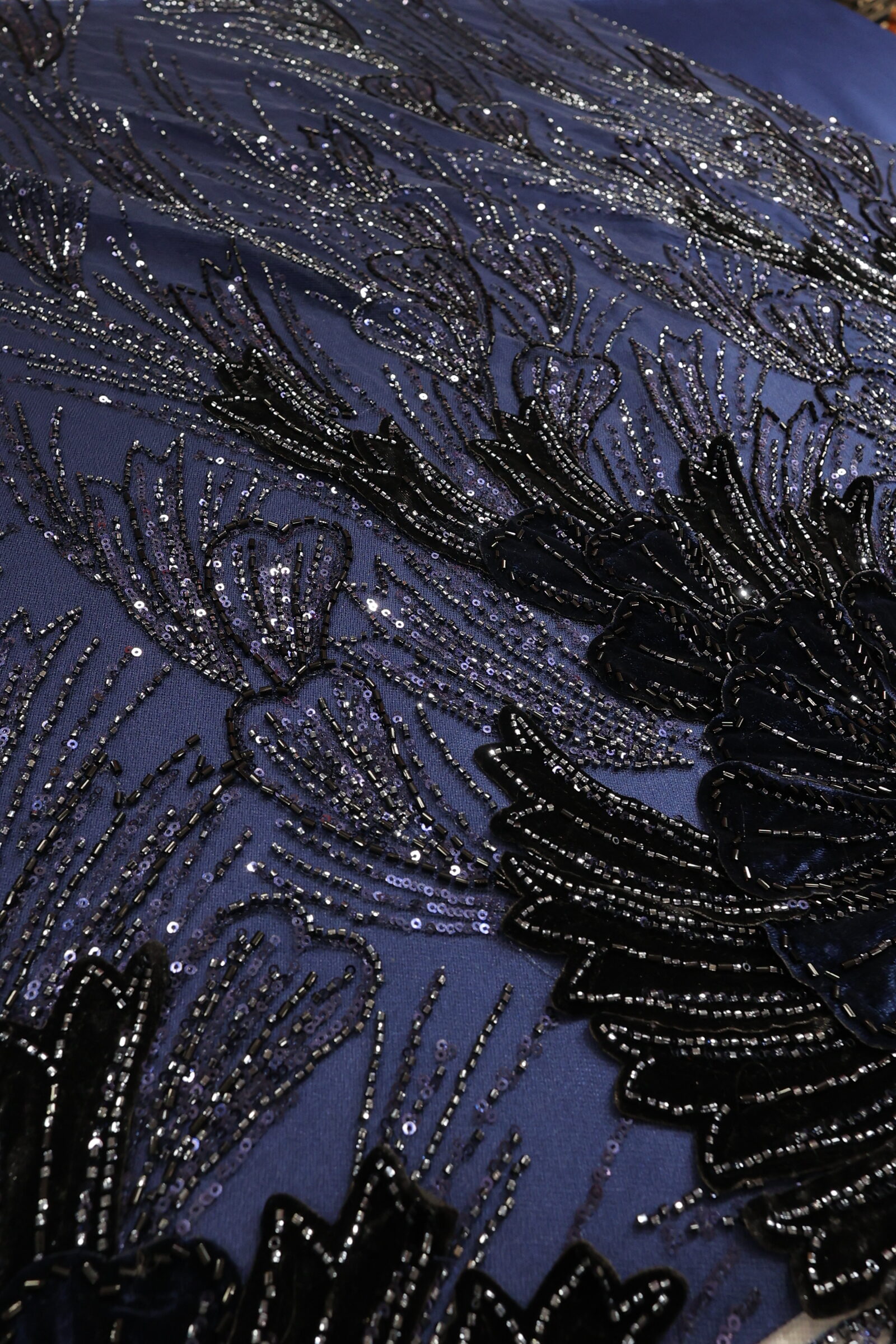 Premium Materijali: Čipka je bogato ukrašena svetlucavim šljokicama i precizno nizanim perlama koje joj daju težinu, luksuzan pad i visok sjaj pod reflektorima.