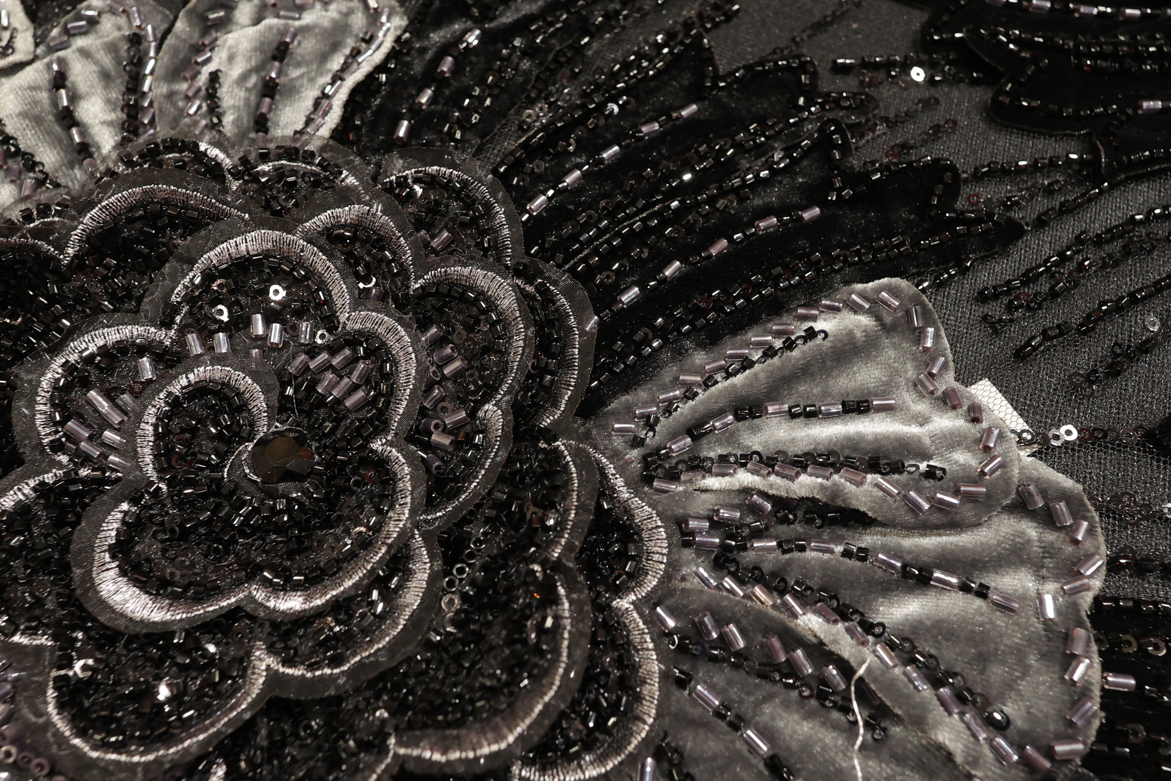 Premium Materijali: Čipka je bogato ukrašena svetlucavim šljokicama i precizno nizanim perlama koje joj daju težinu, luksuzan pad i visok sjaj pod reflektorima.