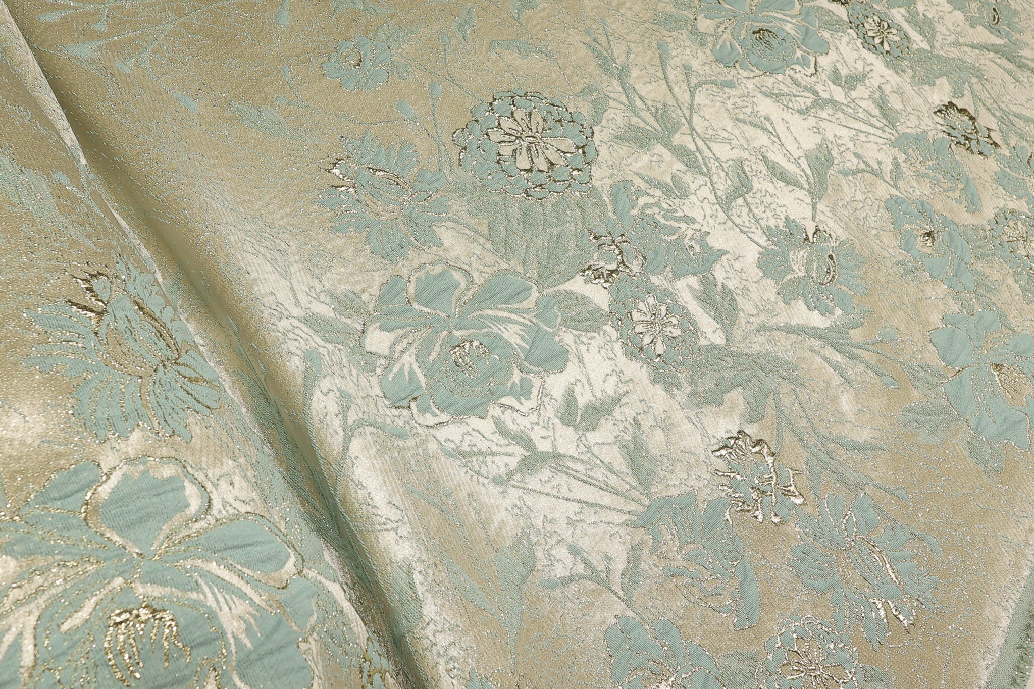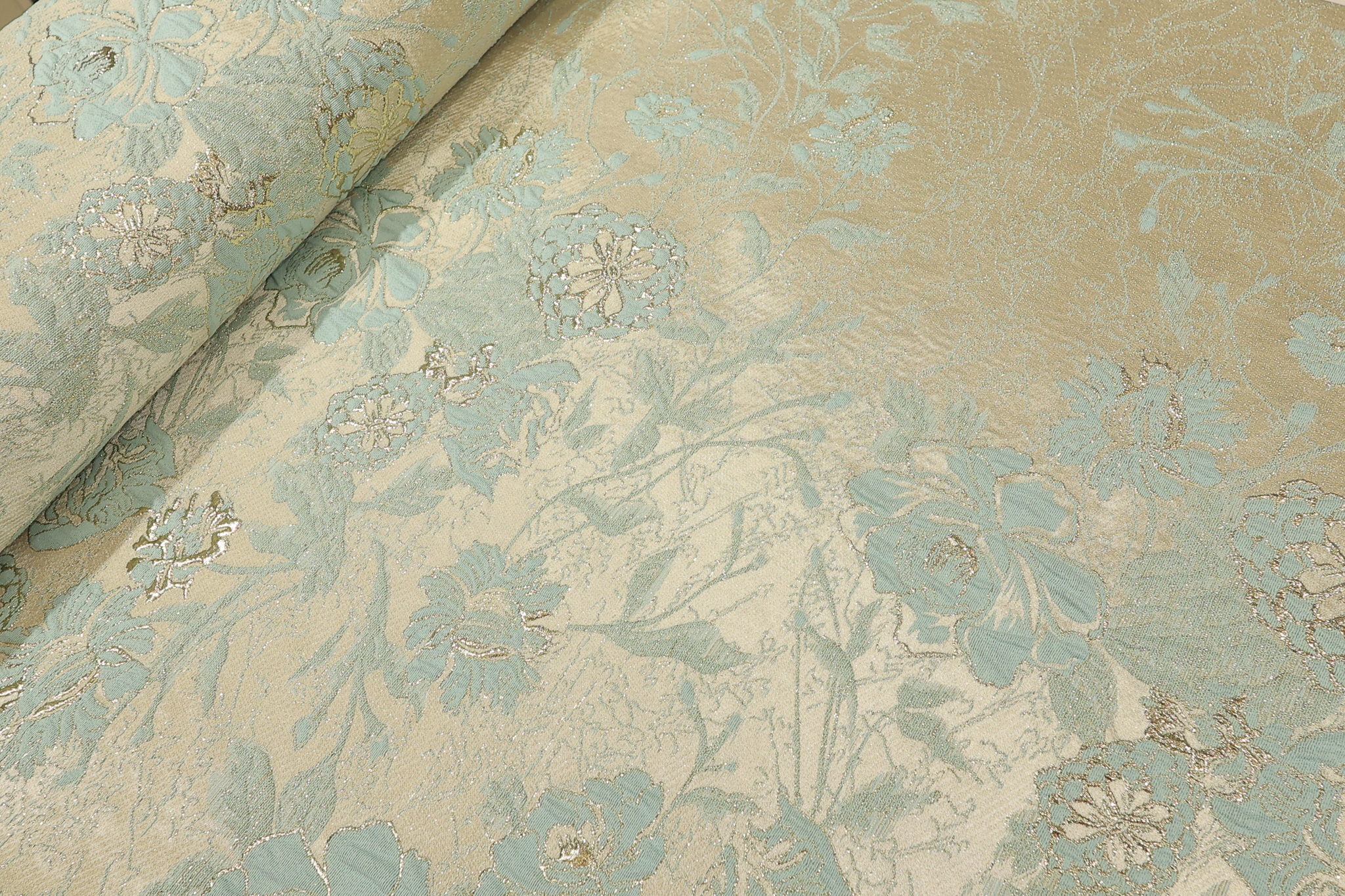 Unesite dozu luksuza u svoje kreacije uz naš Brokat Selection. Ovaj vrhunski materijal iz „Selection“ linije prepoznatljiv je po bogatoj teksturi i asimetričnom cvetnom dezenu. Kombinacija rose gold boje podloge i sjajnih svetlo mint cvetova, sa zlatnim obodom, daje efekat promene boje (shimmer) koji svakom komadu odeće daje kraljevski izgled. Zahvaljujući visokom procentu metaliziranih niti, materijal ima čvrstinu i savršen pad za strukturirane krojeve.