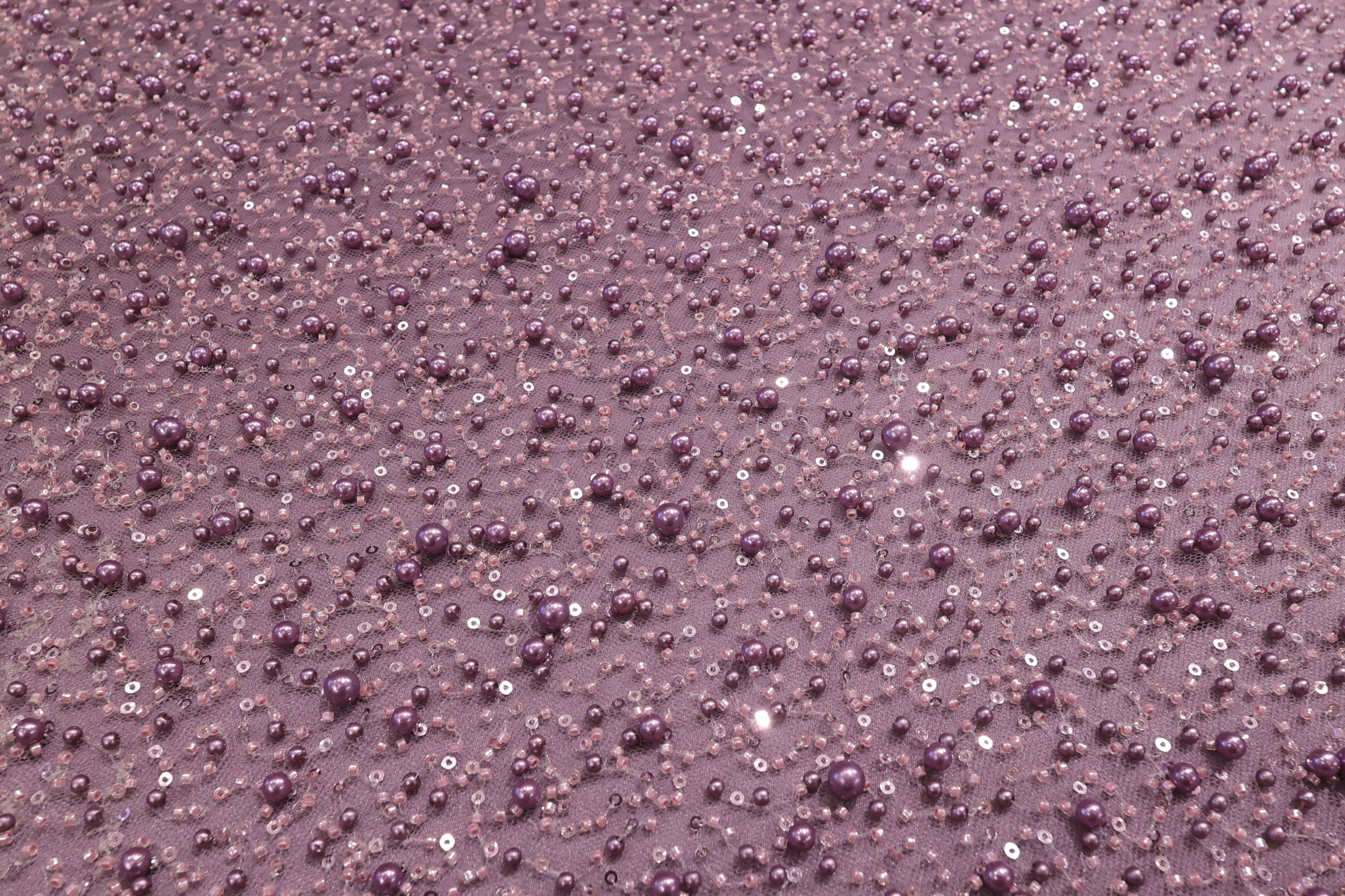 Varijanta guste, jednobojne čipke sa biserima, kristalima i perlicama na tegljivoj mrežici. U odnosu na odabir postave ispod čipke, može ići kako za elastične modele „uz telo“, tako i za kruće oblike.