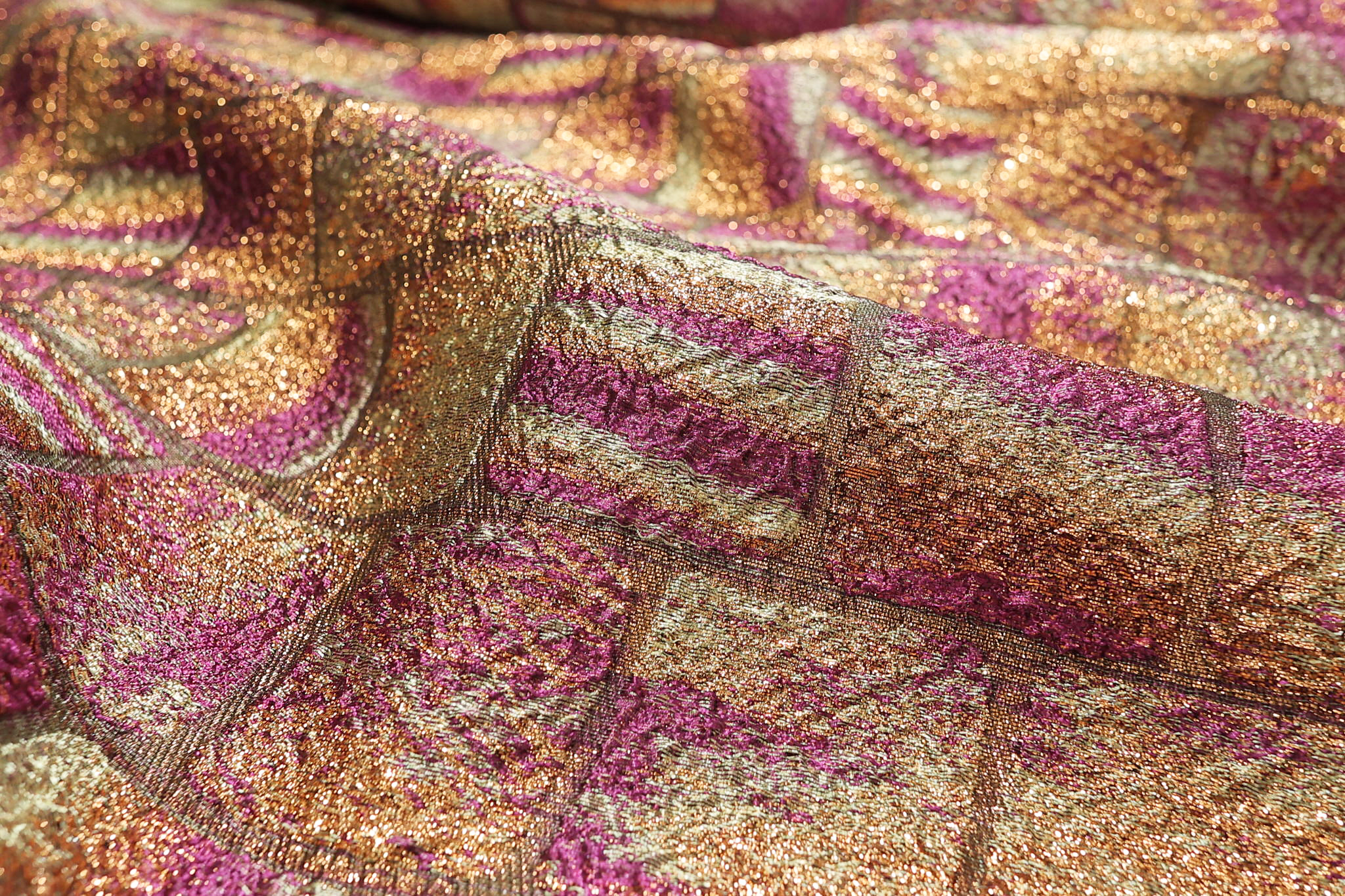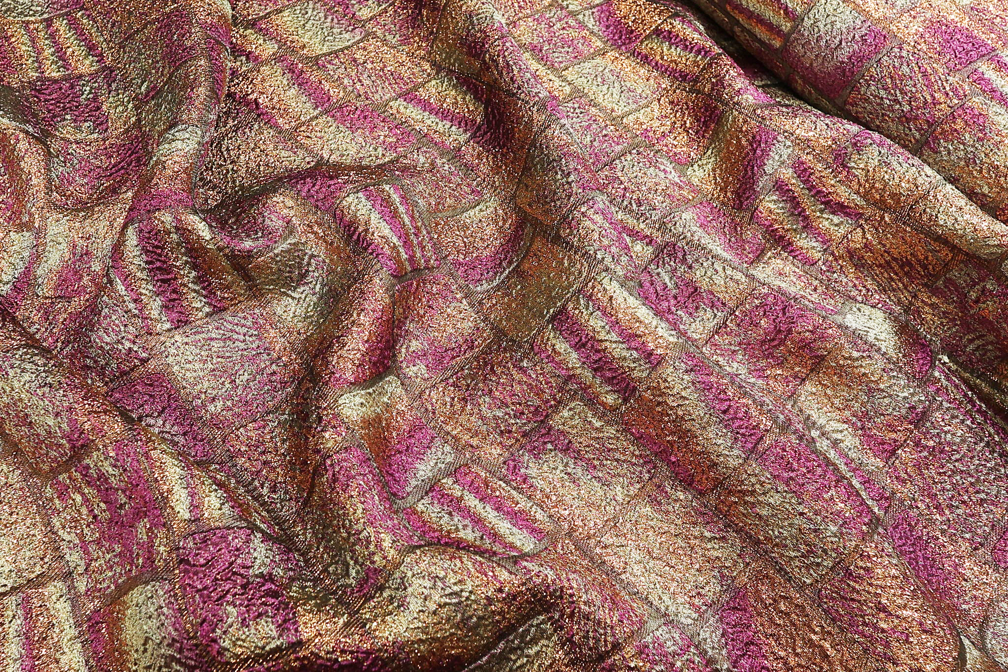 Unesite vrhunski luksuz u svoje dizajnerske kreacije sa ovim ekskluzivnim brokatom u lavanda-bež tonovima. Ovaj materijal karakteriše kompleksan geometrijski dezen sa reljefnom teksturom koja podseća na luksuzni mozaik. Kombinacija toplog sjaja i svetlijih detalja stvara vizuelnu dubinu koja svaku kreaciju čini unikatnom i skupocenom.