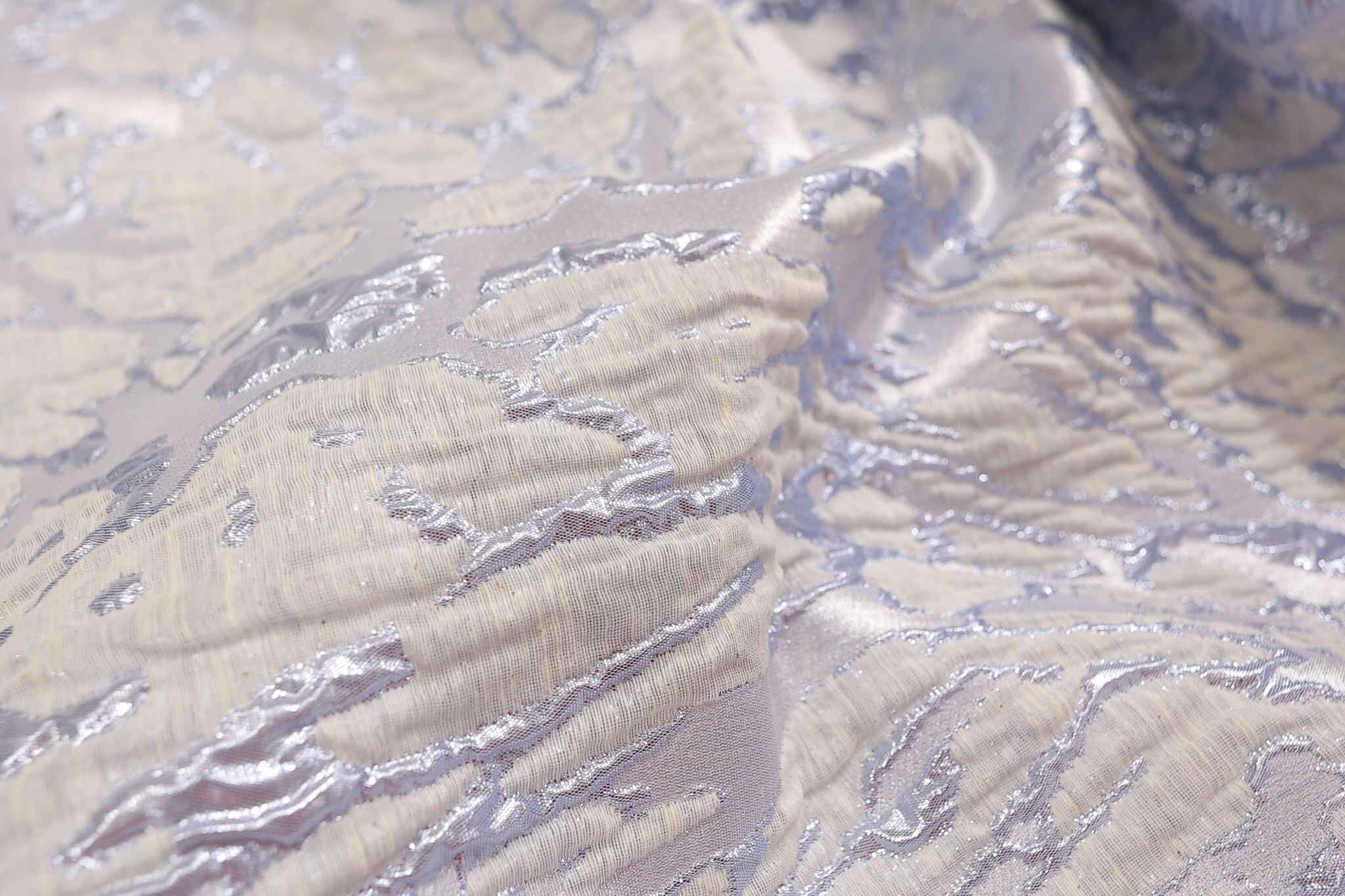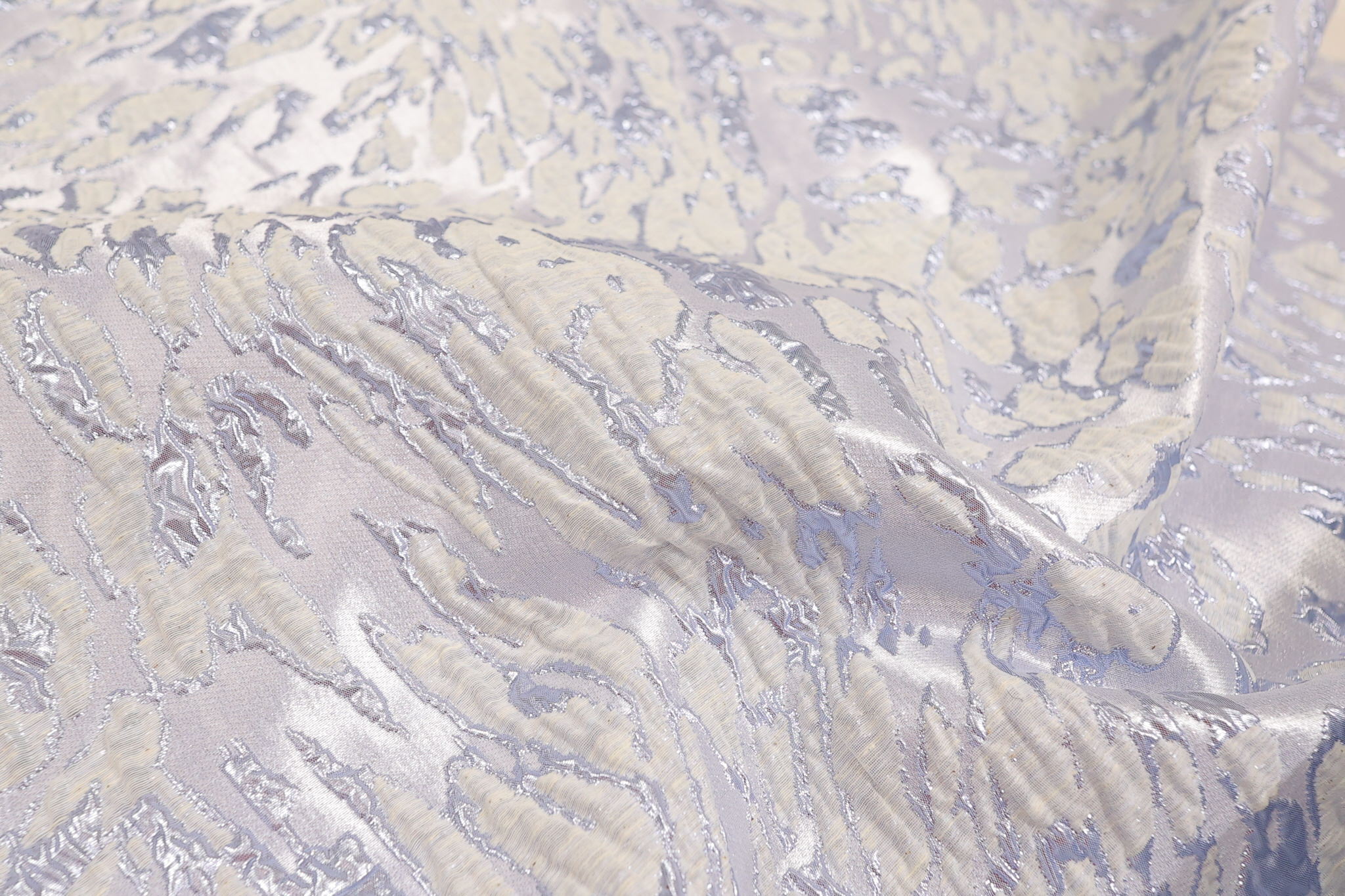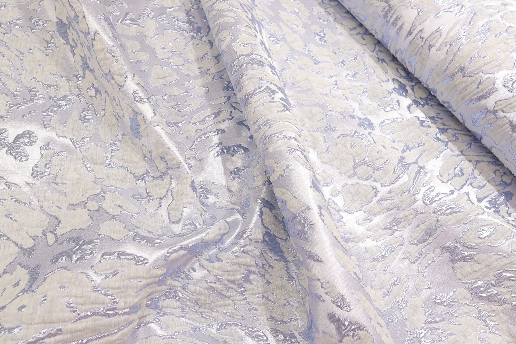 Ovaj materijal vrhunskog kvaliteta odlikuje se bogatom, reljefnom žakard teksturom koja stvara 3D efekat na površini. Prefinjena kombinacija nežno plave osnove i diskretnih metaliziranih niti daje materijalu luksuzan sjaj koji se menja u zavisnosti od svetlosti.