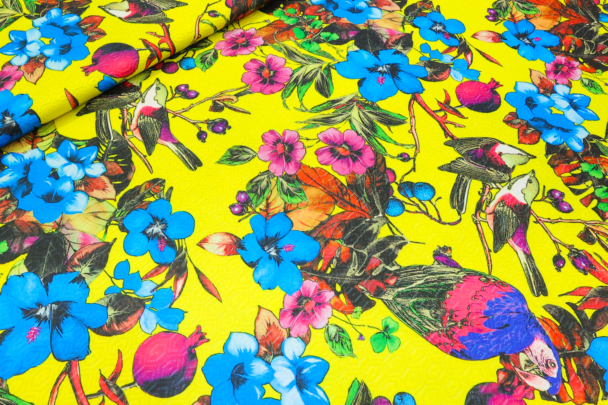Metraža LORAN AC007 – 22 – Žuti Tropski Print (Ptice i Cveće) – Premium Tanja Skuba sa Elastinom