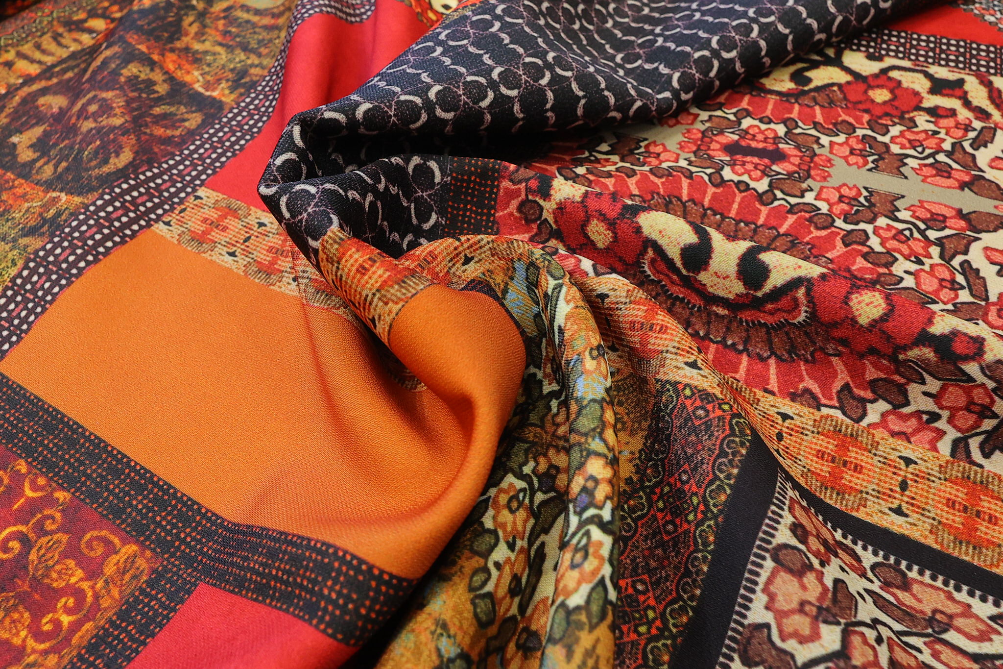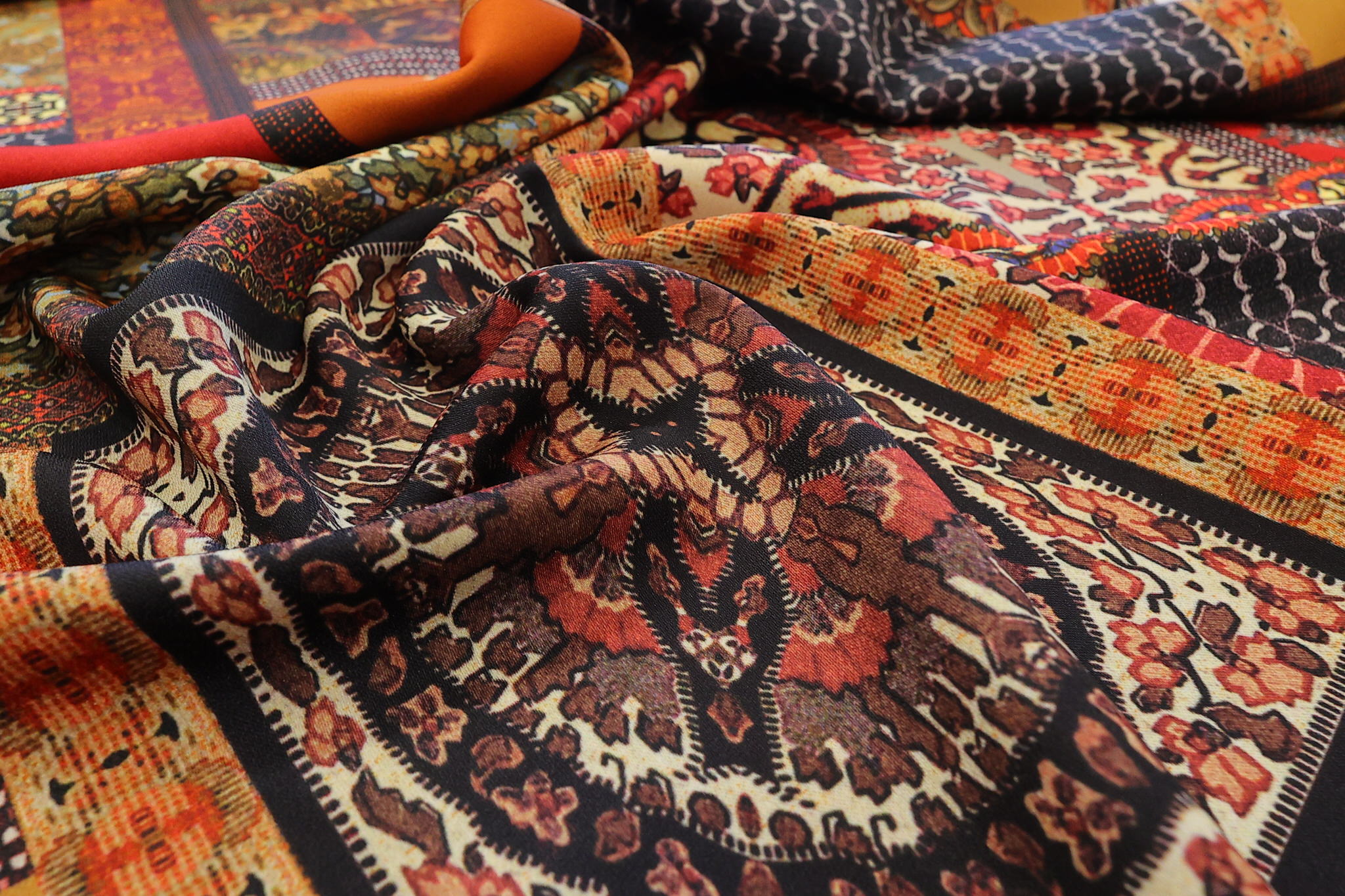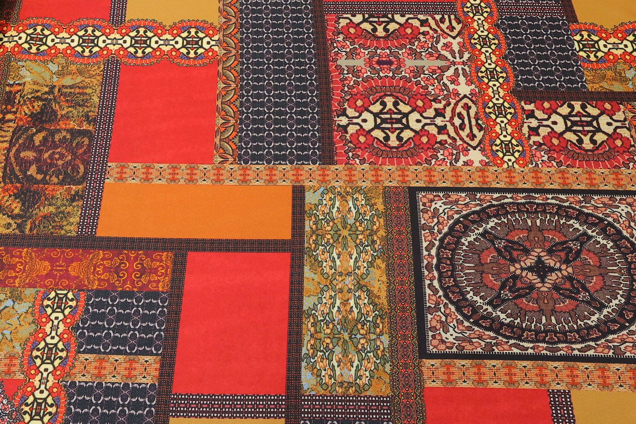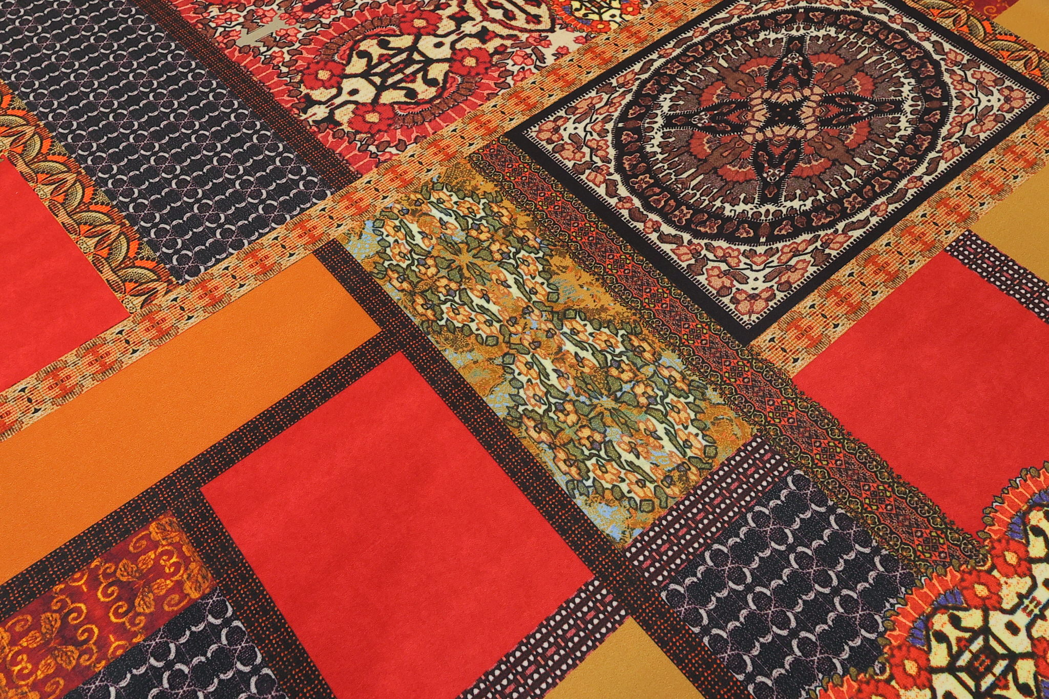 „Zamislite spoj moderne geometrije i bezvremenske tradicije. Ovaj dezen je prava oda toplini – dominiraju bogate nijanse terakote, vatrene crvene i sunčane oker boje, koje se prepliću kroz motive inspirisane raskošnim orijentalnim tepisima i ornamentikom starog sveta.